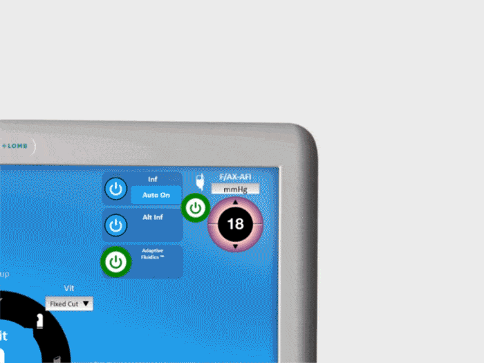 Adaptive Fluidics™ is straightforward to use, with a GUI-integrated toggle control that displays both target and compensated infusion pressures and allows surgeons to easily activate, deactivate, or change settings to their preferred levels for various surgery phases.